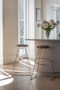 The Casablanca Chair is designed for long dinners, as you sit amazingly well in the chair with a soft backrest that matches the seat. The frame is made of coated metal, the seat and backrest are made of leather, wool, velvet or polyester. That being said – Casablanca can be customized as you prefer and we offer several types of upholstery and frame colors. The dining chair is made in Denmark.