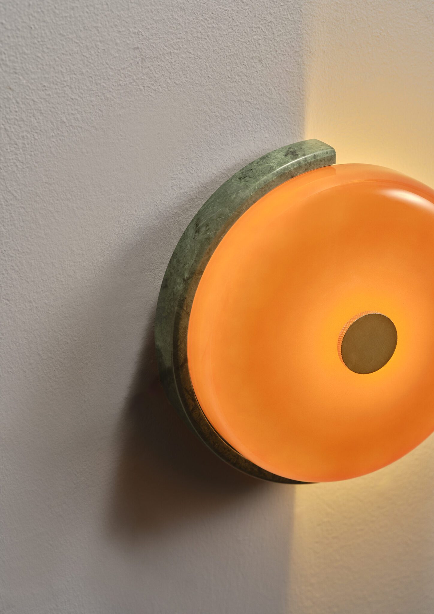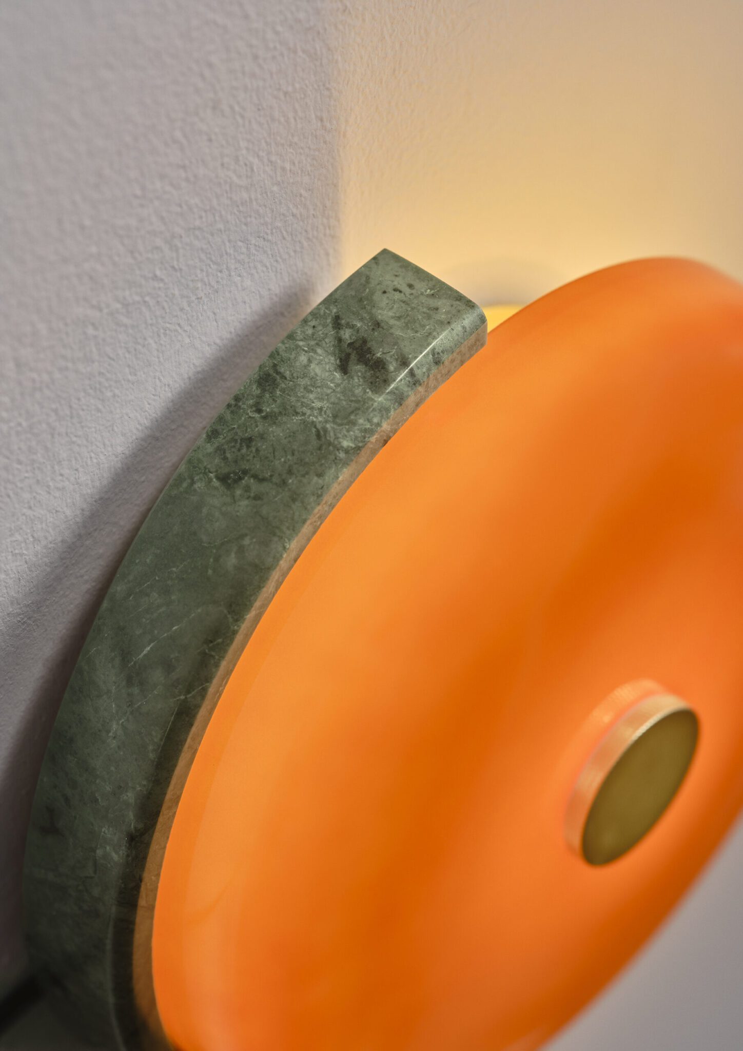 Explore our five different Trip Wall variations of marble. The marble is cut into a half-circle, creating a fan-like light effect from the lamp. It’s possible to purchase additional shades. Extra shades are available in glossy white, matte white, amber, grey, and rose.