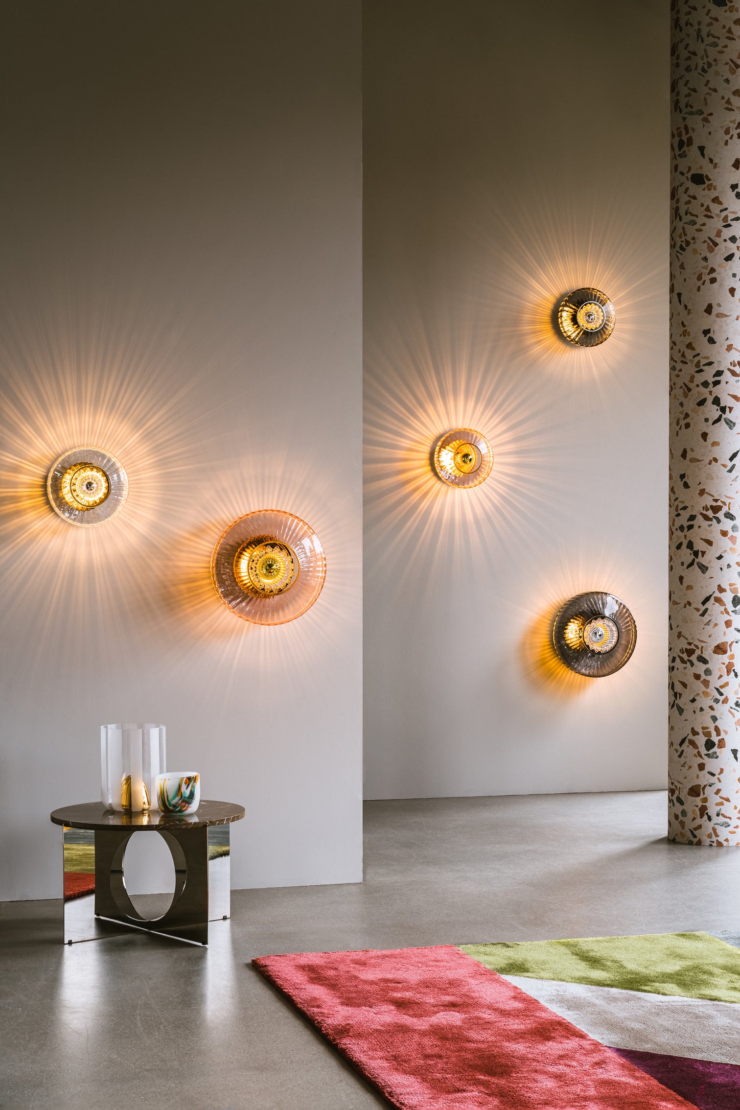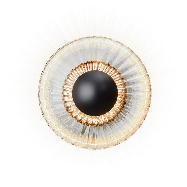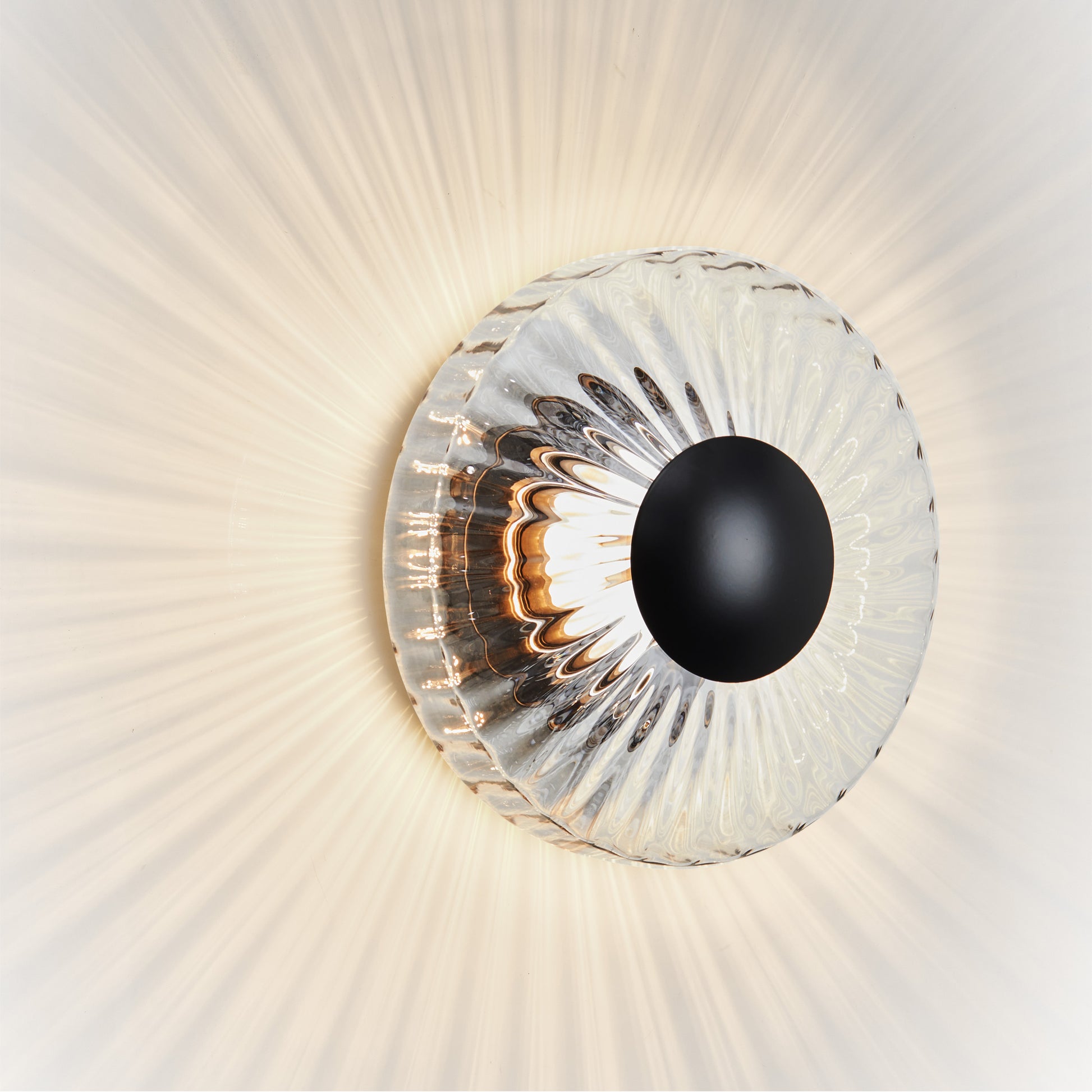 New Wave Optic Wall Outdoor translates the distinctive elegance of the original New Wave series to exterior spaces. The hand-blown wavy glass produces dynamic light and shadow, creating a mesmerizing visual effect. The New Wave Optic Wall Outdoor is dimmable.