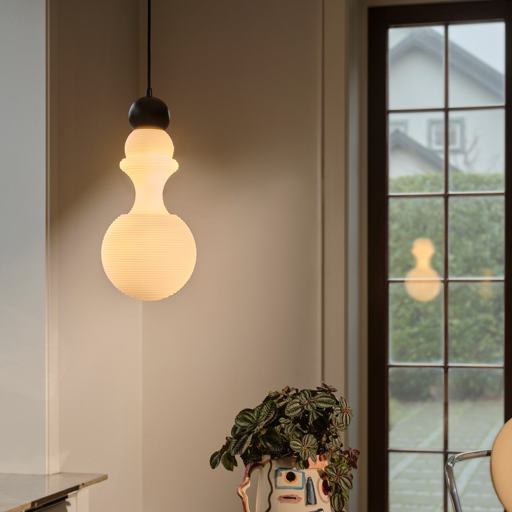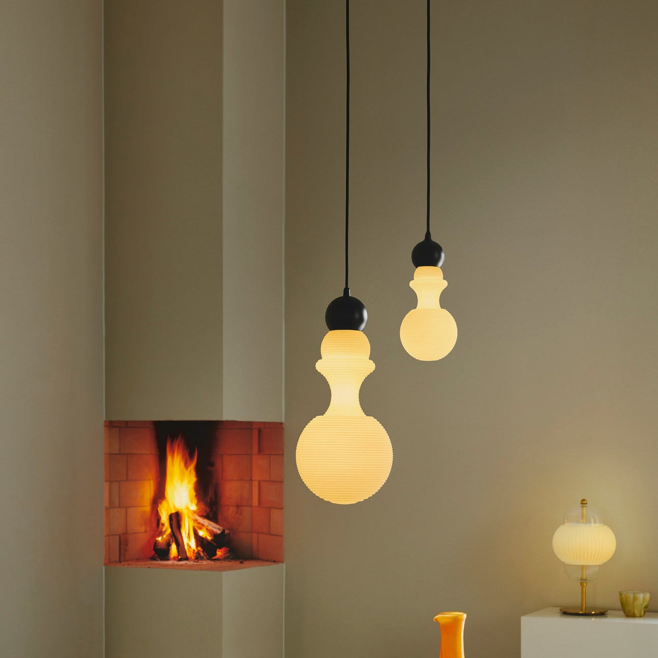 Crafted from opal-colored rippled glass with a black base, Paris 1920 transforms a simple round shape into an elegant drop of light. The softly textured glass diffuses the light beautifully, creating a warm and inviting light that enhances the atmosphere.