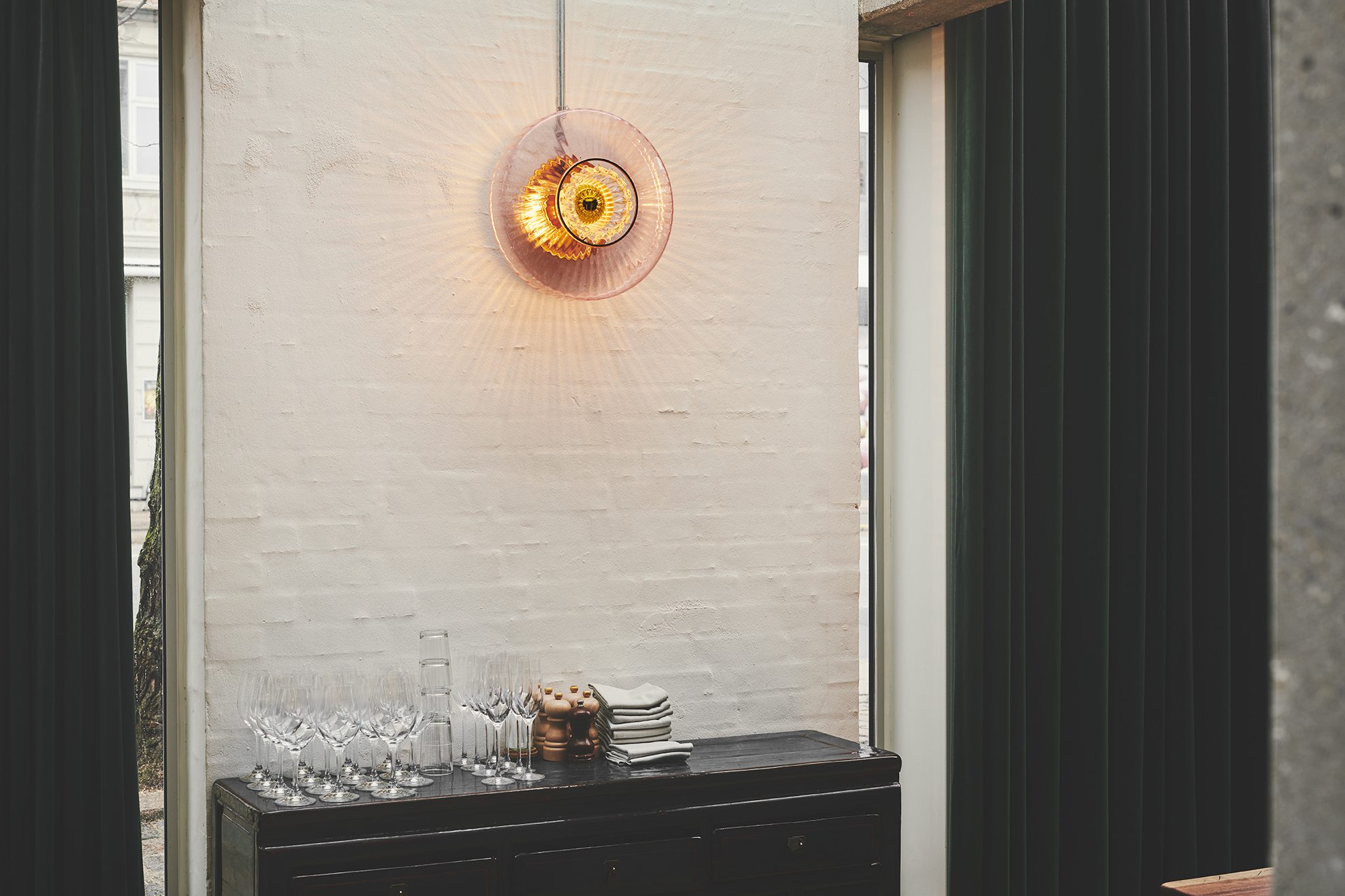 Inside the Restaurant Holly Copenhagen, our New Wave Optic Wall in rose, combined with the Eyeball, created dynamic reflections and a playful ambiance. The lighting choice brought warmth, character, and movement to the interior, supporting Høeg + Møller’s bold and modern design vision. Guests could enjoy a lively yet cozy setting that perfectly matched the restaurant’s energetic spirit.