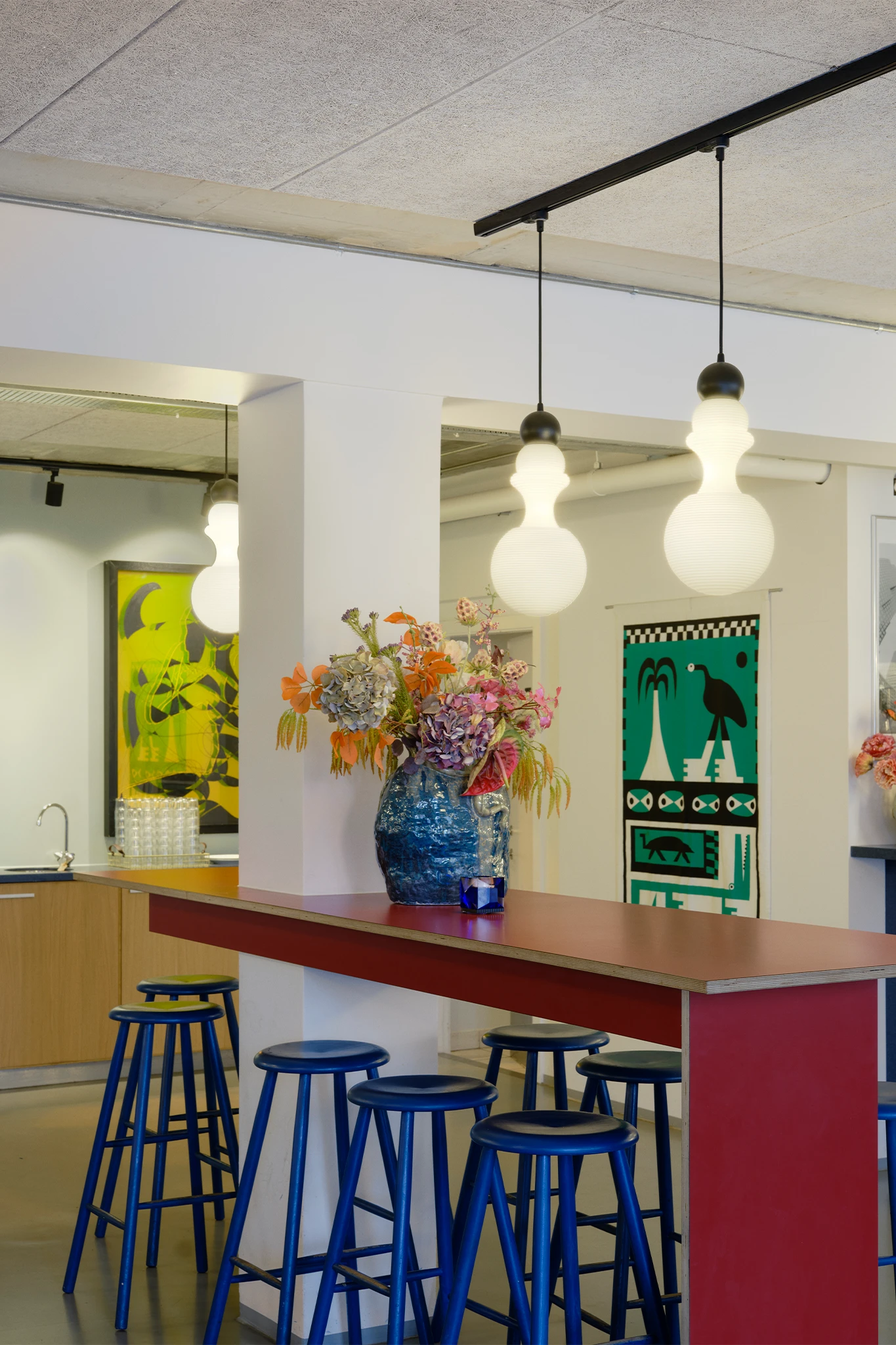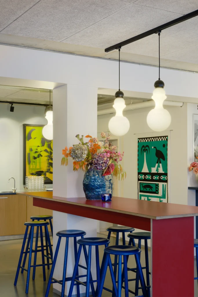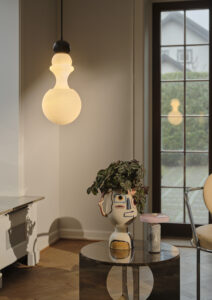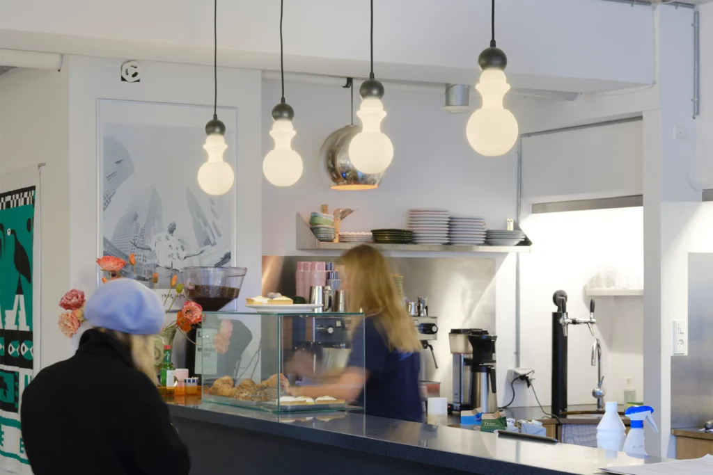 Inside, the Paris 1920 lamp adds a distinctive touch to the cashier area. Its soft, organic silhouette spreads gentle light, enhancing the café’s vibrant character. Available in two sizes, it adapts to various interior arrangements and highlights the attention to detail in the design.