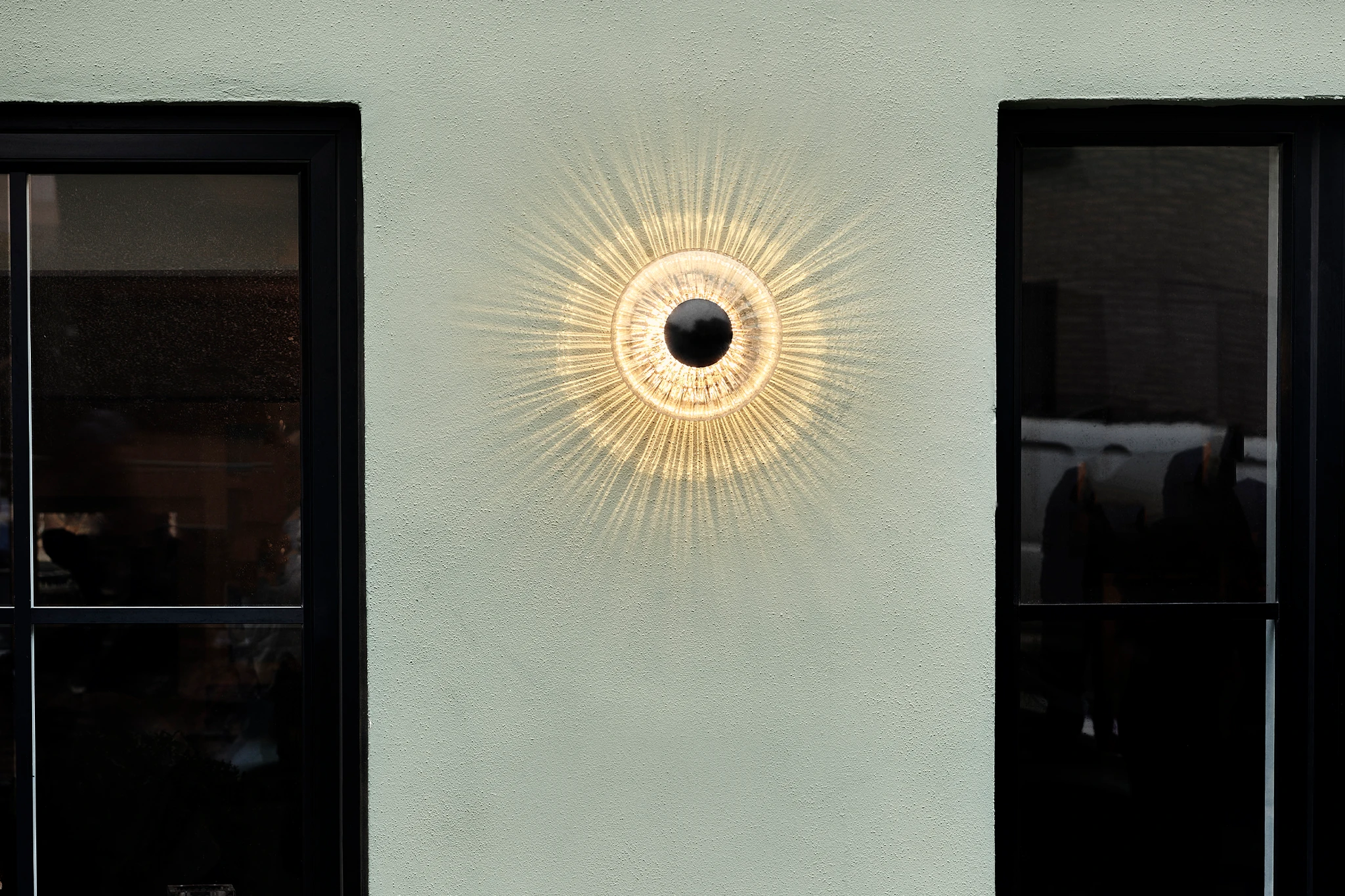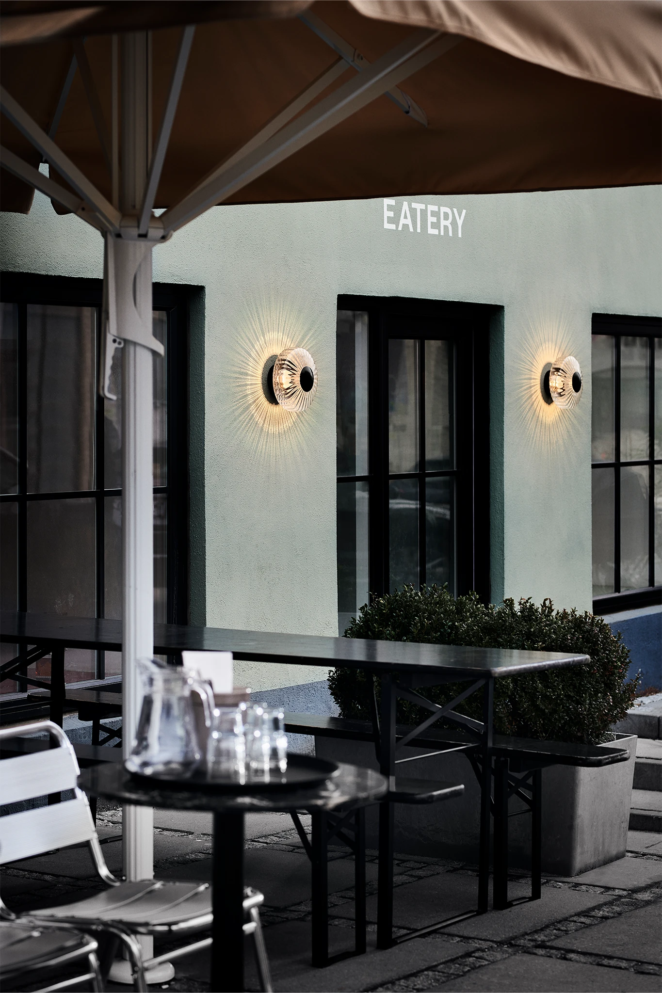To create a cozy entrance, the New Wave Optic Wall Lamp was installed outdoors. It elegantly highlights the façade, even on dark winter mornings. This outdoor lighting complements the indoor lamps, creating a cohesive and inviting atmosphere. Guests immediately feel embraced by the restaurant’s warmth and style.