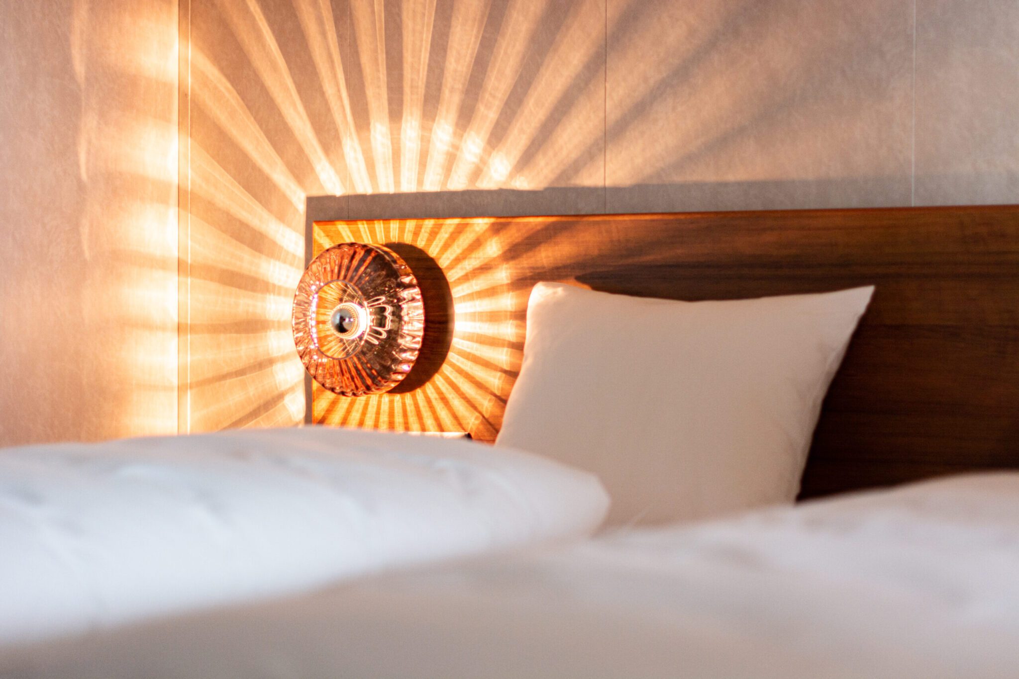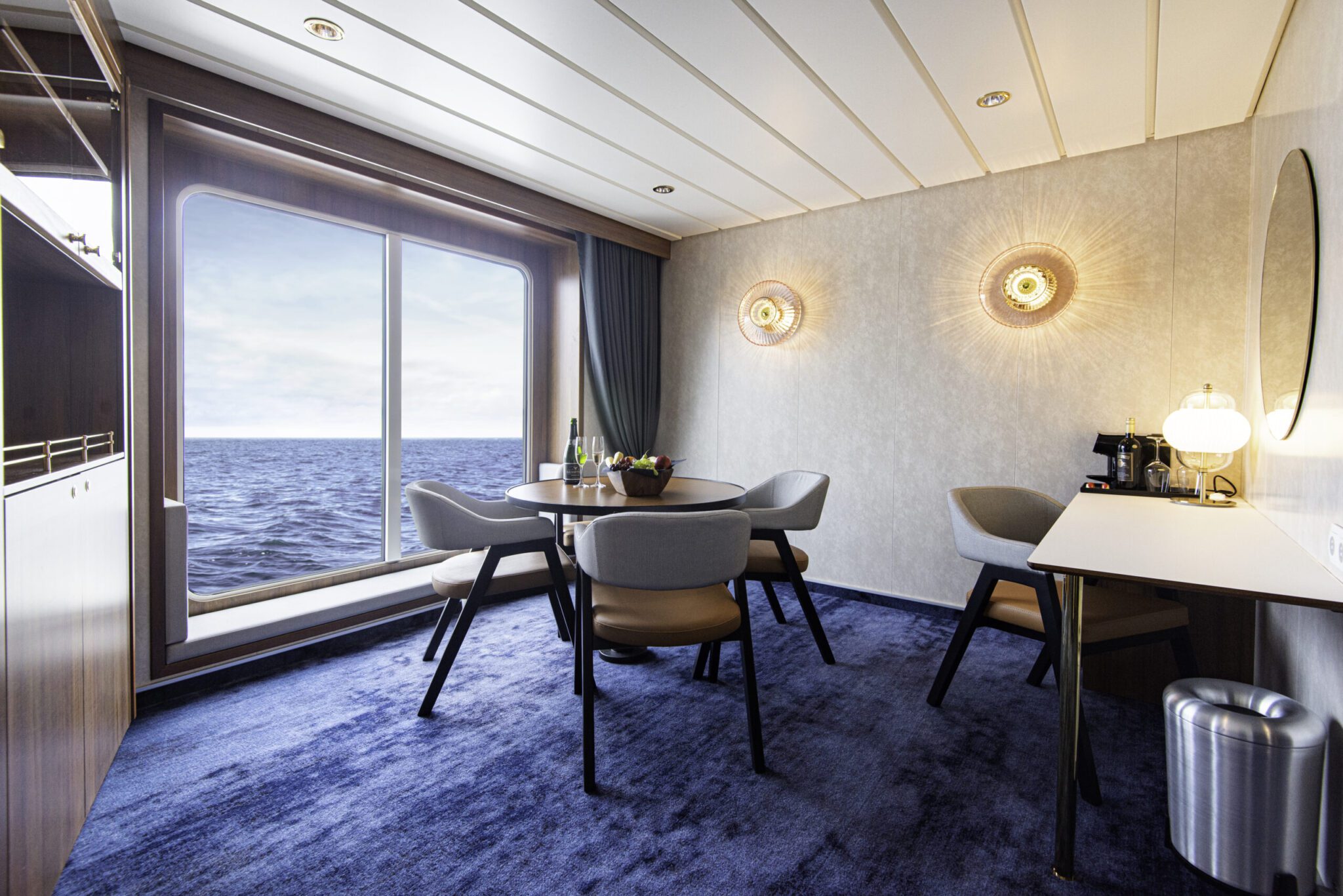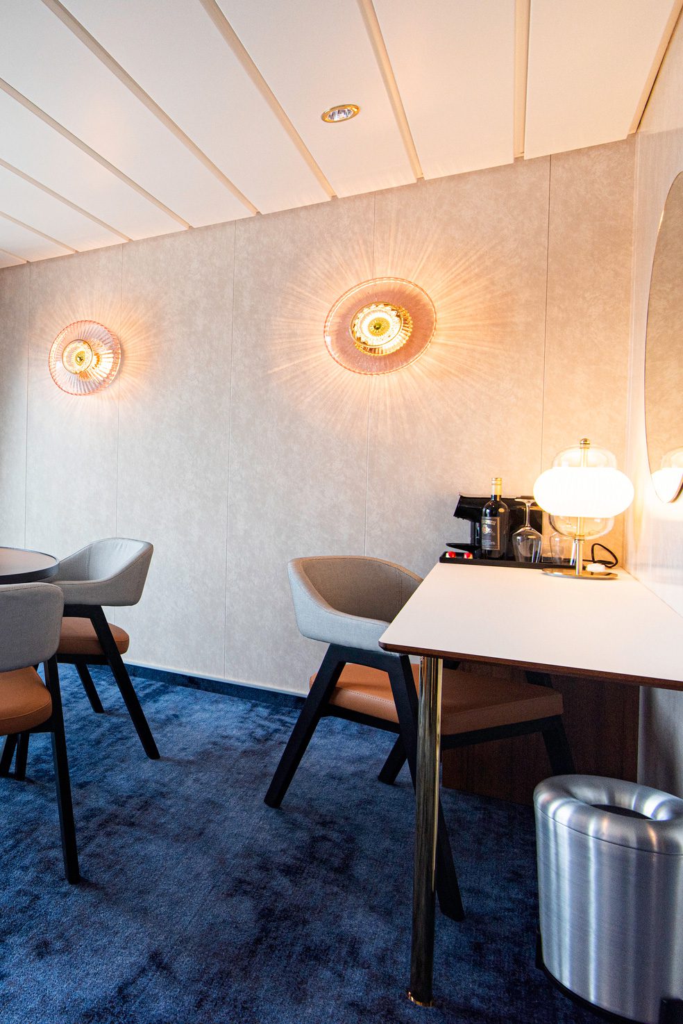 In the suites, New Wave lamps and Shahin table lamps bring warmth and character. The New Wave Optic Wall Lamps act as stylish highlights. In the cabins, the Rose-colored New Wave Optic Wall Lamps pair with Shahin Table Lamps as elegant nightlights. As a result, passengers can relax in calm surroundings after a long day at sea.